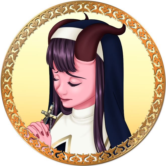 Sister Lumina is a rather peculiar sight. Upon seeing a succubus in a nun's habit, one might assume she's attempting the tempt the pious into sin and give in to lust, but it soon becomes clear it's nothing of the sort. Lumina is as devout as they come despite her demonic heritage. Born and raised within the walls of Saint Mary's Convent and Church of the Sacred Heart, Lumina has spent her life in the service of the Lord. She has a very close relationship with the head priest, Father Cain.